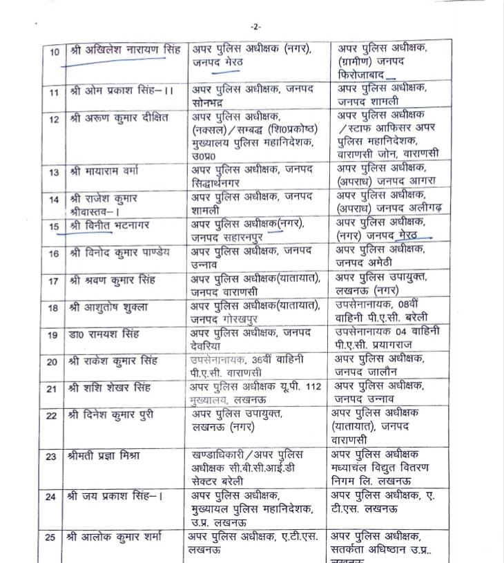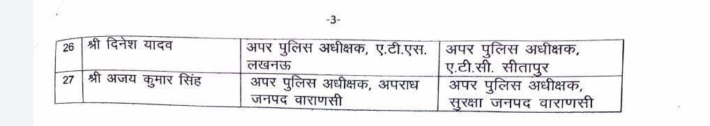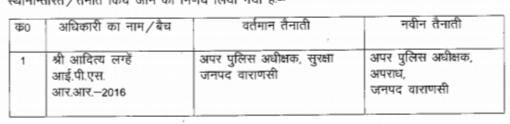 वही बनारस में अपर पुलिस अधीक्षक सुरक्षा के पद पर तैनात आईपीएस अधिकारी आदित्य लगहे को अपर पुलिस अधीक्षक अपराध के पद पर तैनात किया गया है।