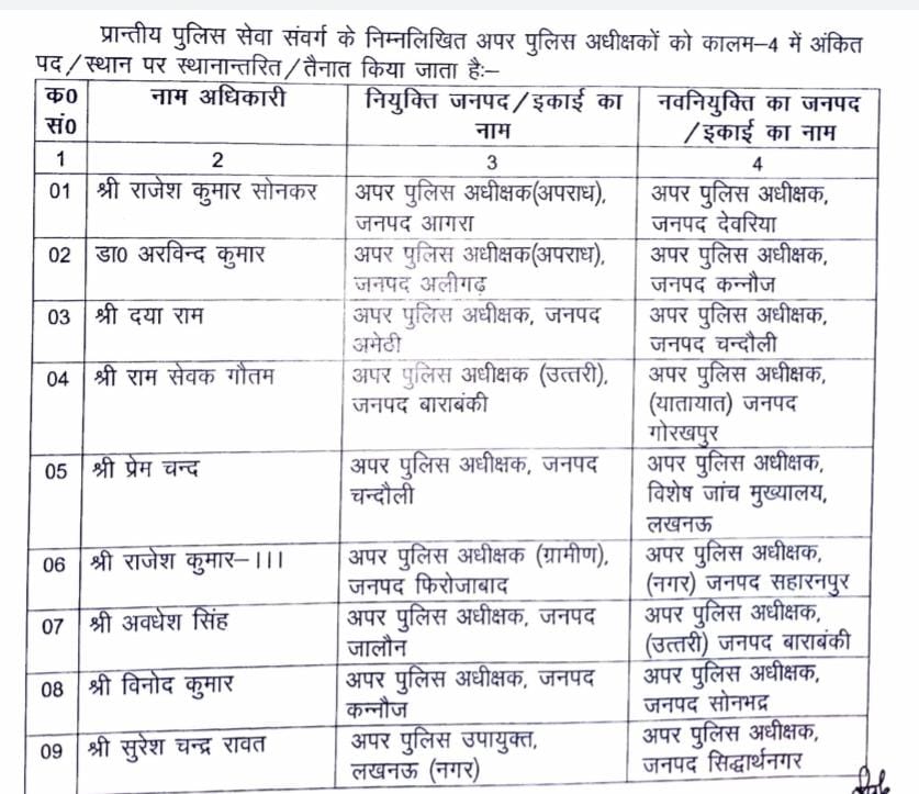 गृह विभाग द्वारा जारी सूची में आप देख सकते हैं कि बड़े पैमाने पर अपर पुलिस अधीक्षकों का तबादला किया गया है।