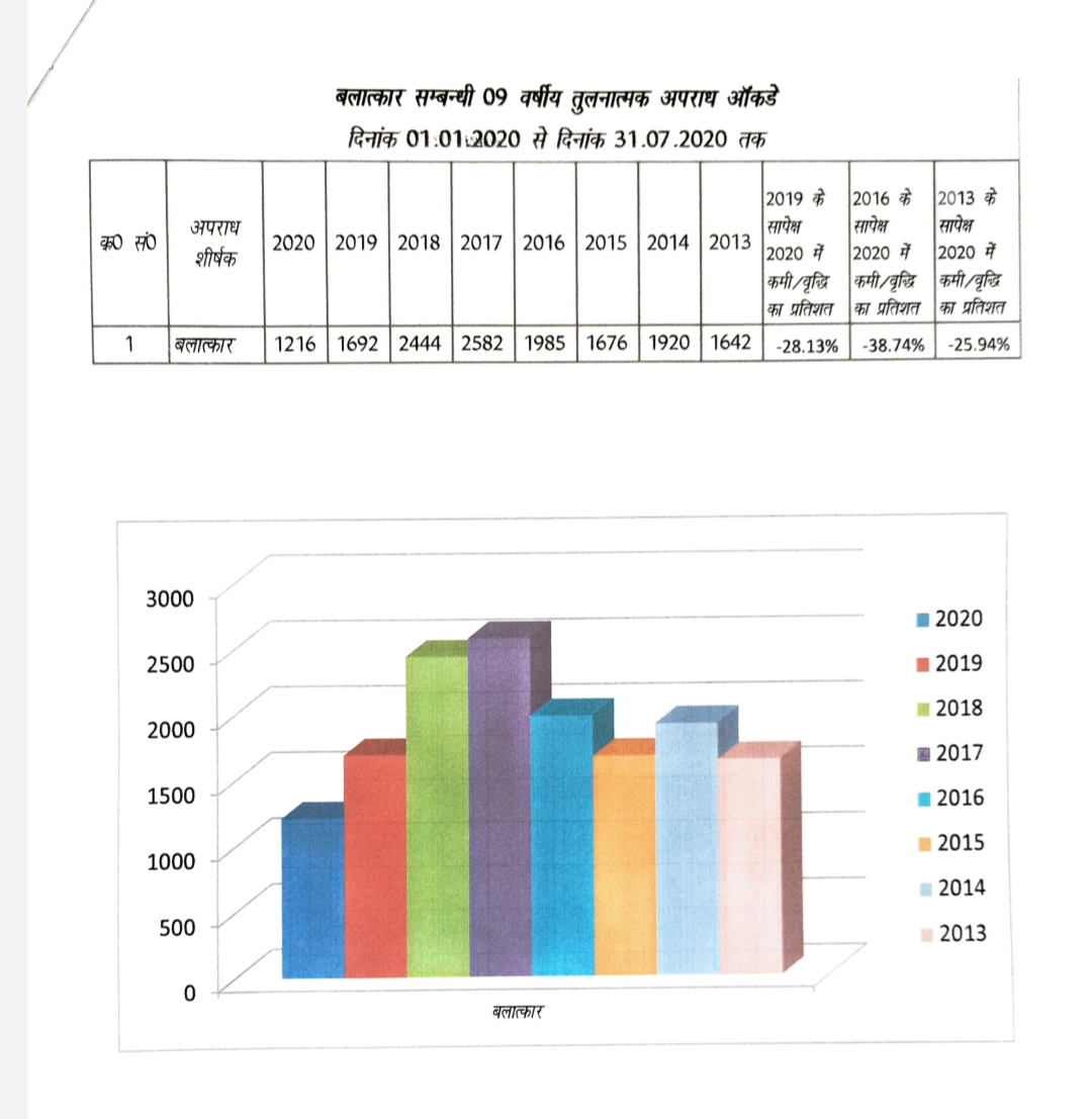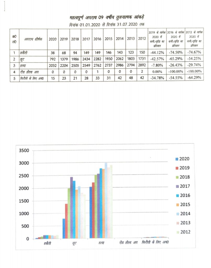 2020 में अब तक डकैती की 38 घटनाएं, बीते साल की अपेक्षा 44.12 फ़ीसदी कम हुई, लूट की 792 घटनाएं, बीते साल की अपेक्षा 42.57 की कमी आई, हत्या की 2032 घटनाएं, बीते साल की अपेक्षा 7.80 की कमी आई, बलात्कार के अब तक 1216 घटनाएं, बीते साल की अपेक्षा 28.13 फीसदी की कमी आई,अब तक गुंडा एक्ट में 17908 गैंगस्टर एक्ट में 2346 और रासुका के तहत 112 अपराधियों और माफियाओं पर कार्रवाई की गई।