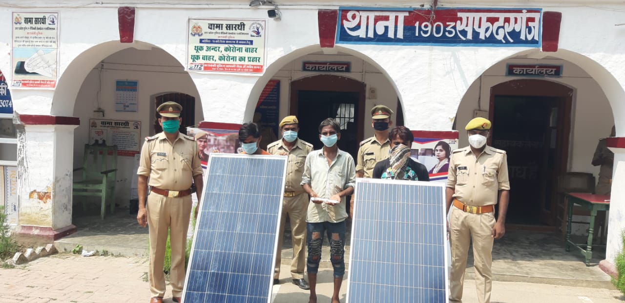 पुलिस अधीक्षक बाराबंकी डॉ अरविन्द चतुर्वेदी द्वारा उक्त घटना का अनावरण कर अभियुक्त की तत्काल गिरफ्तारी के आदेश के क्रम में अपर पुलिस अधीक्षक (दक्षिणी) के दिशा-निर्देशन एवं क्षेत्राधिकारी सदर के पर्यवेक्षण में थानाध्यक्ष सफदरगंज श्री श्रवण कुमार सिंह के नेतृत्व में थाना सफदरगंज पुलिस टीम द्वारा आज दिनांक 10.09.2020 को तीन शातिर चोरों 1. अशोक कुमार चौहान उर्फ मुन्नी पुत्र सुन्दरलाल 2. सानू खान पुत्र मो0 खलील 3. इमरान पुत्र मो0 उस्मान निवासीगण सैदनपुर थाना सफदरगंज जनपद बाराबंकी को समय 06.30 बजे ग्राम सैदनपुर से गिरफ्तार किया गया। अभियुक्तगण के कब्जे से चोरी का दो अदद सोलर पैनल व एक अदद तमंचा 315 बोर मय एक अदद जिन्दा कारतूस 315 बोर बरामद किया गया। अभियुक्तगण के विरूद्ध थाना सफदरगंज पर मु0अ0सं0-280/2020 धारा 3/25 आर्म्स एक्ट बनाम अशोक कुमार पंजीकृत किया गया।