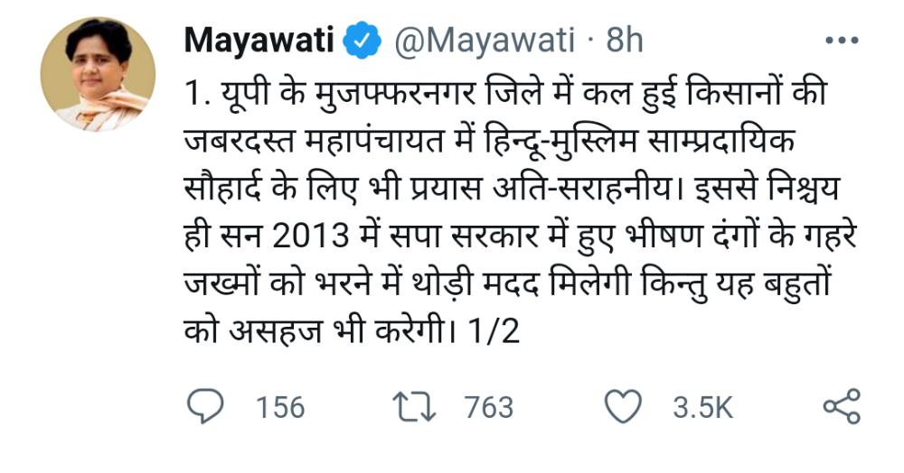 मायवती ने ट्वीट कर कहा कि यूपी के मुजफ्फरनगर जिले में कल हुई किसानों की जबरदस्त महापंचायत में हिन्दू-मुस्लिम साम्प्रदायिक सौहार्द के लिए भी प्रयास अति-सराहनीय है। इससे निश्चय ही सन 2013 में सपा सरकार में हुए भीषण दंगों के गहरे जख्मों को भरने में थोड़ी मदद मिलेगी किन्तु यह बहुतों को असहज भी करेगी।