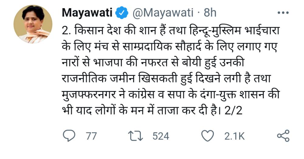 मायावती ने अपने अगले ट्वीट में कहा, “किसान देश की शान हैं तथा हिन्दू-मुस्लिम भाईचारा के लिए मंच से साम्प्रदायिक सौहार्द के लिए लगाए गए नारों से भाजपा की नफरत से बोयी हुई उनकी राजनीतिक जमीन खिसकती हुई दिखने लगी है। मुजफ्फरनगर ने कांग्रेस व सपा के दंगा-युक्त शासन की भी याद लोगों के मन में ताजा कर दी है।”
