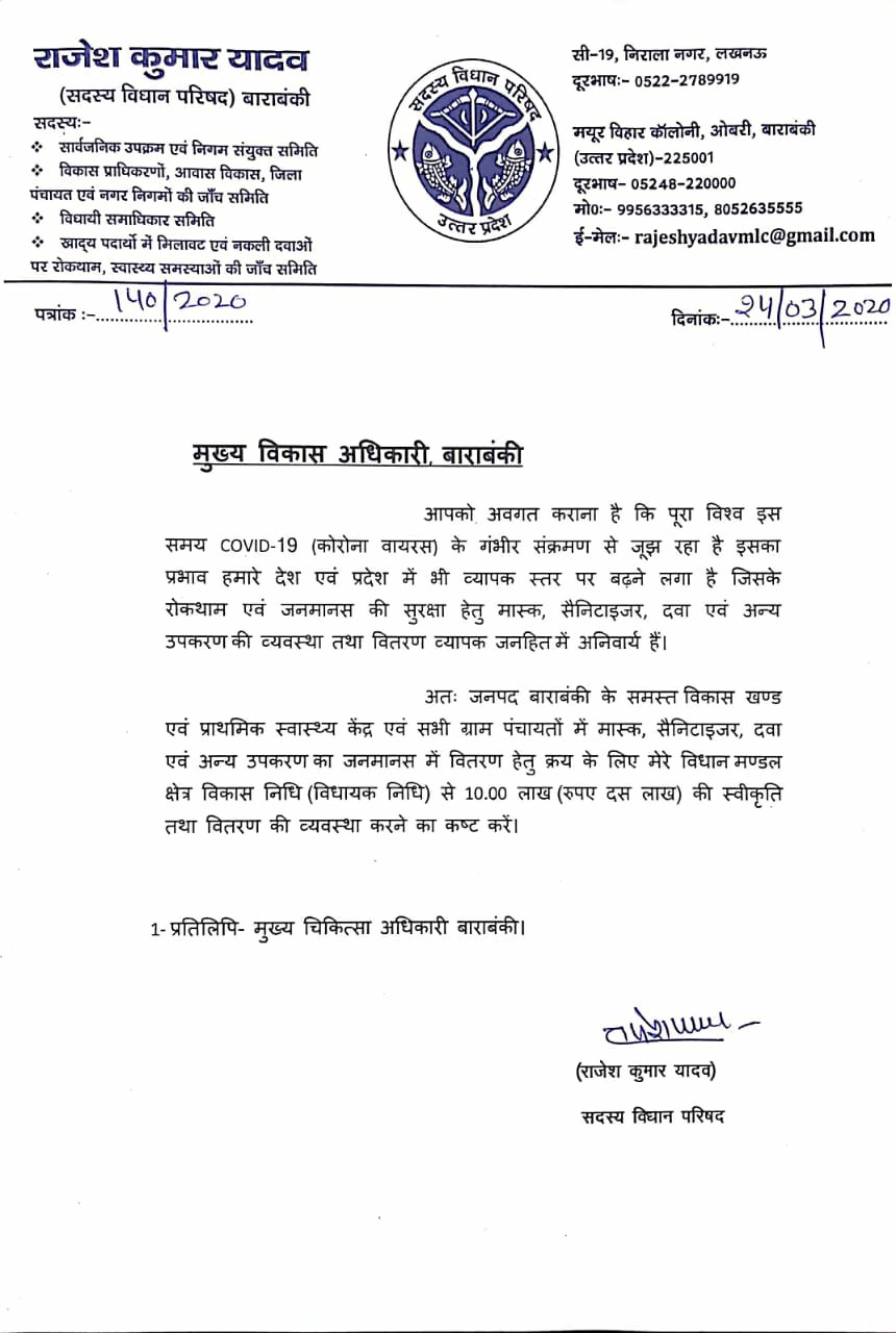 मुख्य विकास अधिकारी को लिखे पत्र में एमएलसी राजेश यादव राजू ने कहा है कि पूरा विश्व इस समय कोरोना वायरस के संक्रमण से जूझ रहा है ऐसे में हमारे प्रदेश में भी व्यापक स्तर पर इसमें बढ़ोतरी हो रही है और इसके रोकथाम के लिए सभी आवश्यक उपाय करने जरूरी हैं।