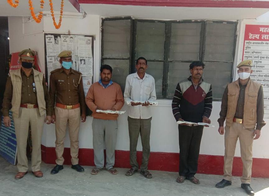 उपरोक्त के क्रम में अपर पुलिस अधीक्षक उत्तरी आर.एस. गौतम के निर्देशन में क्षेत्राधिकारी फतेहपुर योगेन्द्र कुमार के पर्यवेक्षण व थानाध्यक्ष बड्डूपुर गजेन्द्र प्रताप के नेतृत्व में आज मैनुअल इंटेलीजेन्स के आधार पर ग्राम रहिलामऊ पुल के बीच स्थित झोपड़ी में चोरी की योजना बनाते हुए अभियुक्तगण निजामुद्दीन पुत्र मजहर अली, युसुफ पुत्र नसीर सर्व निवासीगण जियनपुर थाना बड्डूपुर जनपद बाराबंकी व मुनौव्वर पुत्र इदरीश निवासी सलेमपुर थाना बड्डूपुर जनपद बाराबंकी को गिरफ्तार किया गया। तलाशी में अभियुक्तगण के कब्जे से 03 तमंचा मय 03 कारतूस .315 बोर, 01 हथौड़ी, 01 प्लास व 01 अदद सरिया बरामद किया गया । अभियुक्तगण के विरुद्ध थाना बड्डूपुर पर मु0अ0सं0 23/2021 धारा 401 भा0द0वि0 व मु0अ0सं0 24-26/2021 धारा 3/25 आर्म्स एक्ट पंजीकृत किया गया।