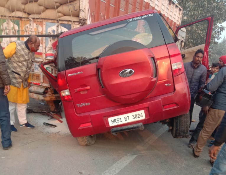 सूत्रों से मिली जानकारी के अनुसार टीयूवी कार नम्बर एचआर 51 बीटी 3824 के चालक गिरिप्रसाद पुत्र ठाकुरलाल निवासी हसनगंज लखनऊ हरियाणा में चल रहे ब्रह्मकुमारी सम्मेलन में शामिल होकर देवरिया वापस जा रहे थे कि हॉइवे पर रसौली गांव के निकट उदय राइस मिल के सामने धान से लदी खड़ी ट्रक में कार असुन्तलित होकर घुस गयी।