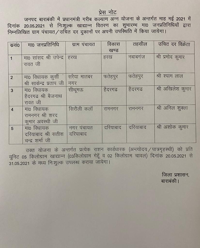 बाराबंकी। जनपद में प्रधानमंत्री गरीब कल्याण अन्न योजना के अंतर्गत माह मई 2021 में कल से निःशुल्क खाद्यान्न वितरण का शुभारंभ जनप्रतिनिधियों द्वारा ग्राम पंचायत/ उचित दर दुकानों पर अपनी अनुपस्थिति में किया जाएगा।