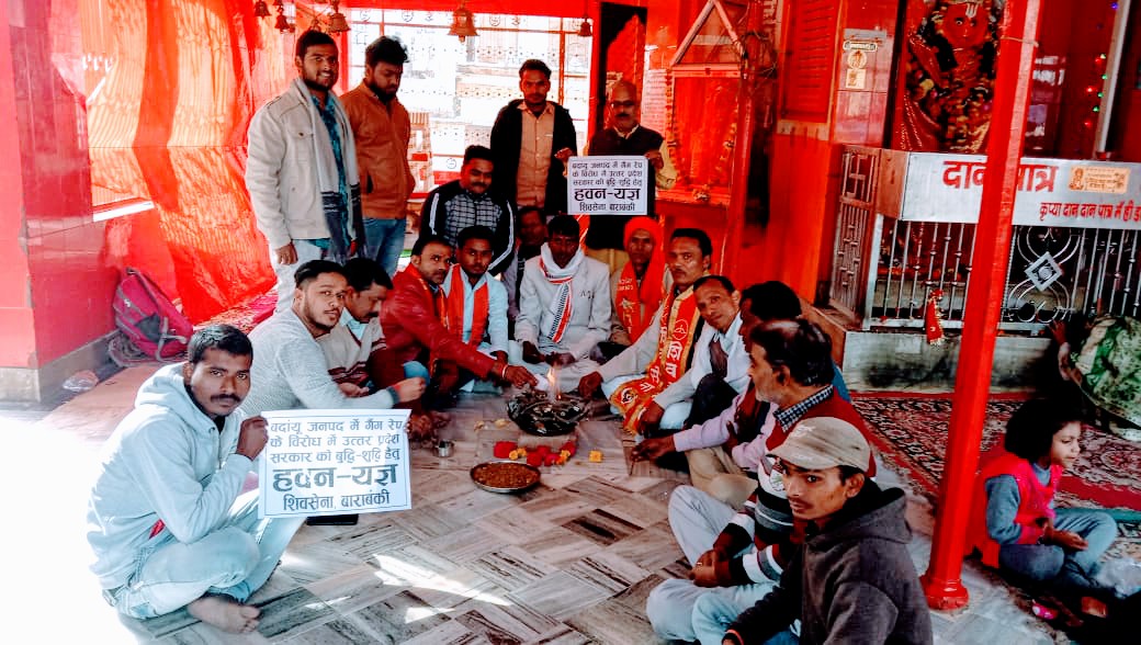 बाराबंकी। गत दिनों बदायूँ में महिला के साथ गैंगरेप व हैवानियत के विरोध में कानून व्यवस्था पर उंगली उठाते हुए शिवसैनिकों ने पार्टी के जिला प्रमुख मनोज विद्रोही के नेतृत्व में नगर के धनोखर हनुमान मंदिर पर प्रदेश व केंद्र सरकार की बुद्धि शुद्धि हेतु यज्ञ कर विरोध जताया।