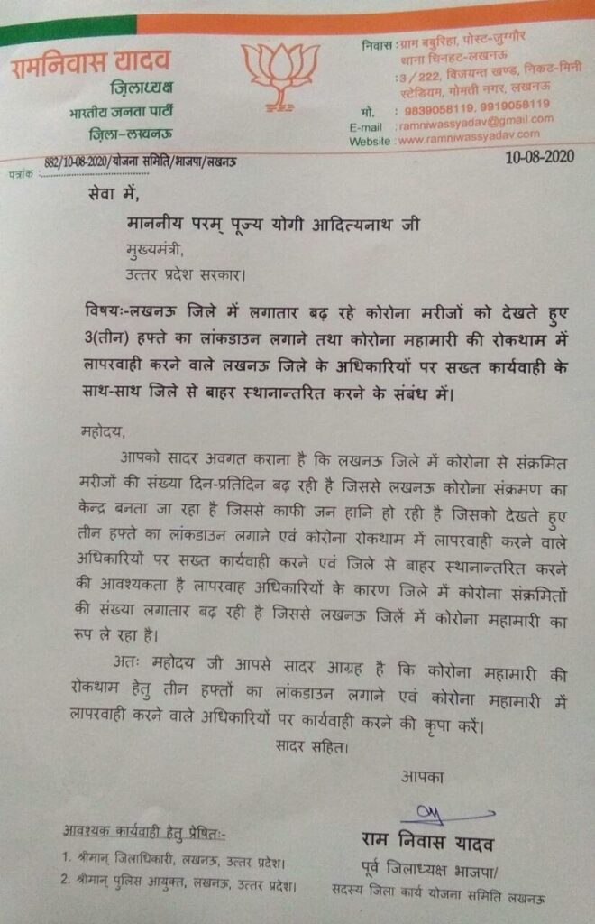 बीजेपी के वरिष्ठ नेता रामनिवास यादव कहते हैं कि उन्होंने मुख्यमंत्री योगी आदित्यनाथ को पत्र लिखकर लखनऊ से लापरवाह अफसरों को हटाने की मांग की है जिससे कोरोना नियंत्रण में आ सके और लोगों को शासन की मंशा के अनुसार सुविधाएं मिल सकें।