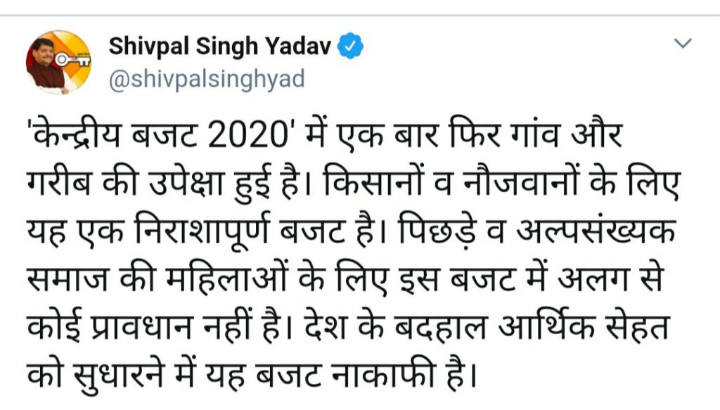 अब केंद्रीय बजट आया है तो शिवपाल यादव ने अपने समर्थकों में संदेश देने के लिए एक बार फिर केंद्र सरकार की आलोचना की है। केंद्रीय बजट 2020 प्रतिक्रिया देते हुए शिवपाल यादव ने बयान जारी करते हुए कहा है कि, केंद्रीय बजट 2020 में एक बार फिर गांव और गरीब की उपेक्षा हुई है किसानों व नौजवानों की यह एक निराशा पूर्ण बजट है पिछड़े व अल्पसंख्यक समाज की महिलाओं के लिए बजट में अलग से कोई प्रावधान नहीं है देश के बदहाल आर्थिक सेहत को सुधारने में यह बजट ना काफी है।