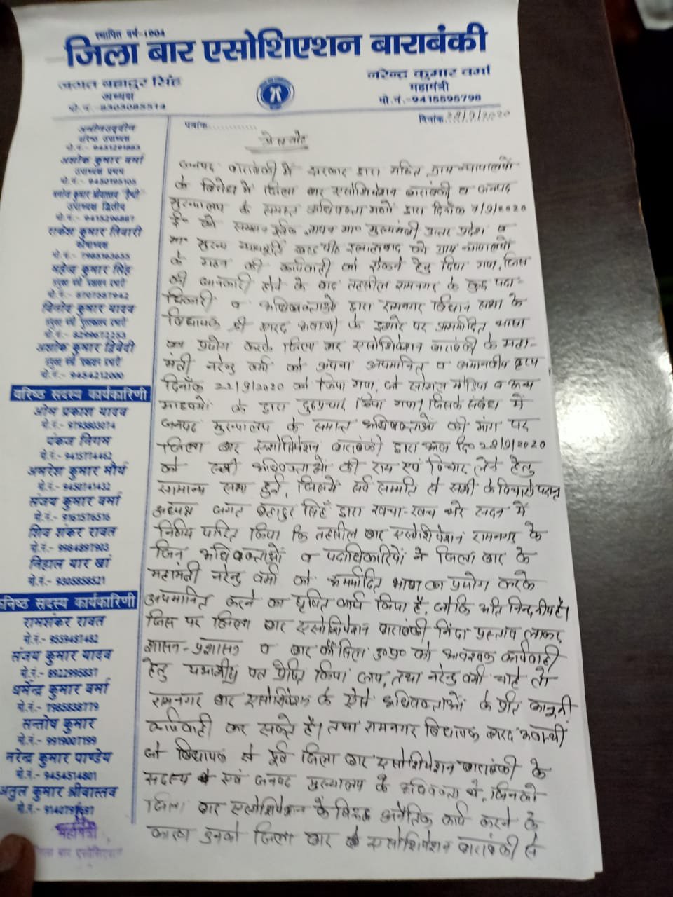 बाराबंकी। जिला बार एसोसिएशन बाराबंकी की आम सभा का आयोजन किया गया था जिसमे सैकड़ो अधिवक्ताओं ने हिस्सा लिया था। आम सभा मे अधिवक्ताओं के मध्य ग्राम न्यायालय के गठन का मामला छाया रहा और इसी के साथ जिला बार के महामन्त्री के साथ किये गए अभद्र व्यवहार का मुद्दा भी चर्चा का विषय बना रहा। रामनगर के अधिवक्ताओं द्वारा महामन्त्री के विरुद्ध अमर्यादित भाषा का प्रयोग किये जाने के कारण निंदा प्रस्ताव भी पारित किया गया और भाजपा से रामनगर विद्यायक को सदस्यता से निष्कासित करने का फैसला सर्वसम्मति से लिया गया।