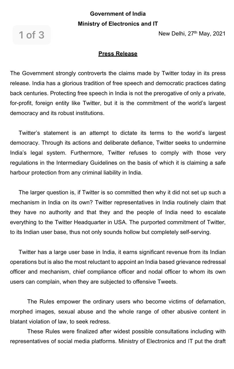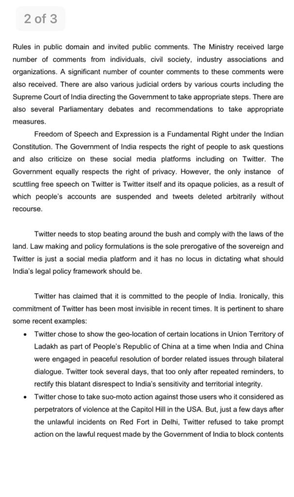 केंद्र के सूचना प्रसारण मंत्री रविशंकर प्रसाद ट्विटर की मनमानी पर कानूनी कार्यवाही का ऐलान करने की बजाय ट्विटर के आरोपों पर सरकार की ओर से सफाई दे रहे हैं। रविशंकर प्रसाद कहते हैं कि ट्विटर भारत के बनाए हुए कानूनों को मानने के लिए तैयार नहीं है मनमानी और अराजकता को बढ़ावा दे रहा है।