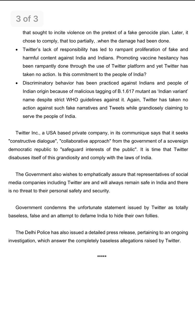 लेकिन ट्विटर को भारतीय कानूनों को पालन करने के लिए बाध्य करने की बजाय रविशंकर प्रसाद की सफाई देने से लोगों में निराशा और नाराजगी है। जिस तरह से केंद्र सरकार और भाजपा नेतृत्व देश में अराजकता के खिलाफ कठोर रवैया अपनाने की बजाय रक्षात्मक रवैया अपना रहा है उससे, सरकार और बीजेपी को हर तरह से नुकसान उठाना पड़ सकता हैl