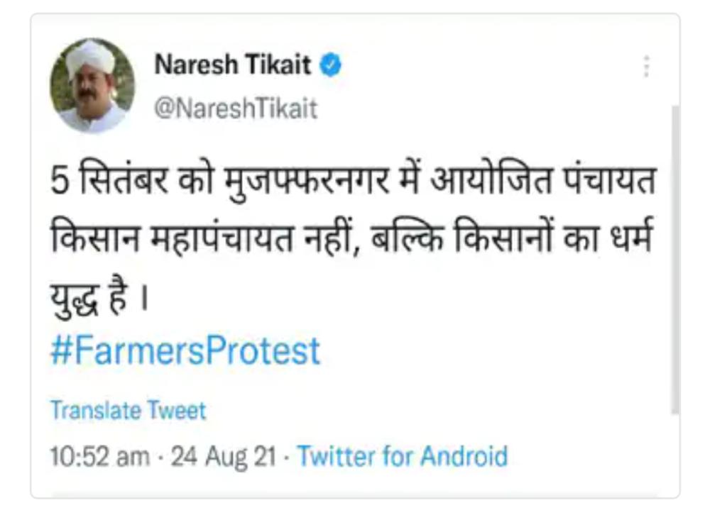 केंद्र सरकार के तीन कृषि कानूनों के खिलाफ किसानों का आंदोलन जारी है। इसी कड़ी में 5 सितंबर को भारतीय किसान यूनियन (भाकियू-टिकैत गुट) पश्चिमी उत्तर प्रदेश के मुजफ्फरनगर में महापंचायत करने जा रही है। जिसमें 5 राज्यों से लाखों किसानों के शामिल होने का दावा किया जा रहा है। भाकियू के राष्ट्रीय प्रवक्ता राकेश टिकैत के भाई और संगठन अध्यक्ष नरेश टिकैत ने कहा कि मुजफ्फरनगर में आयोजित पंचायत किसान महापंचायत नहीं, बल्कि किसानों का धर्मयुद्ध है।