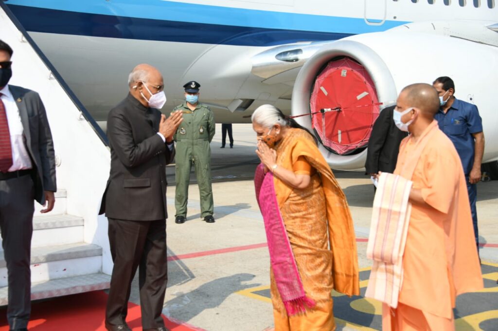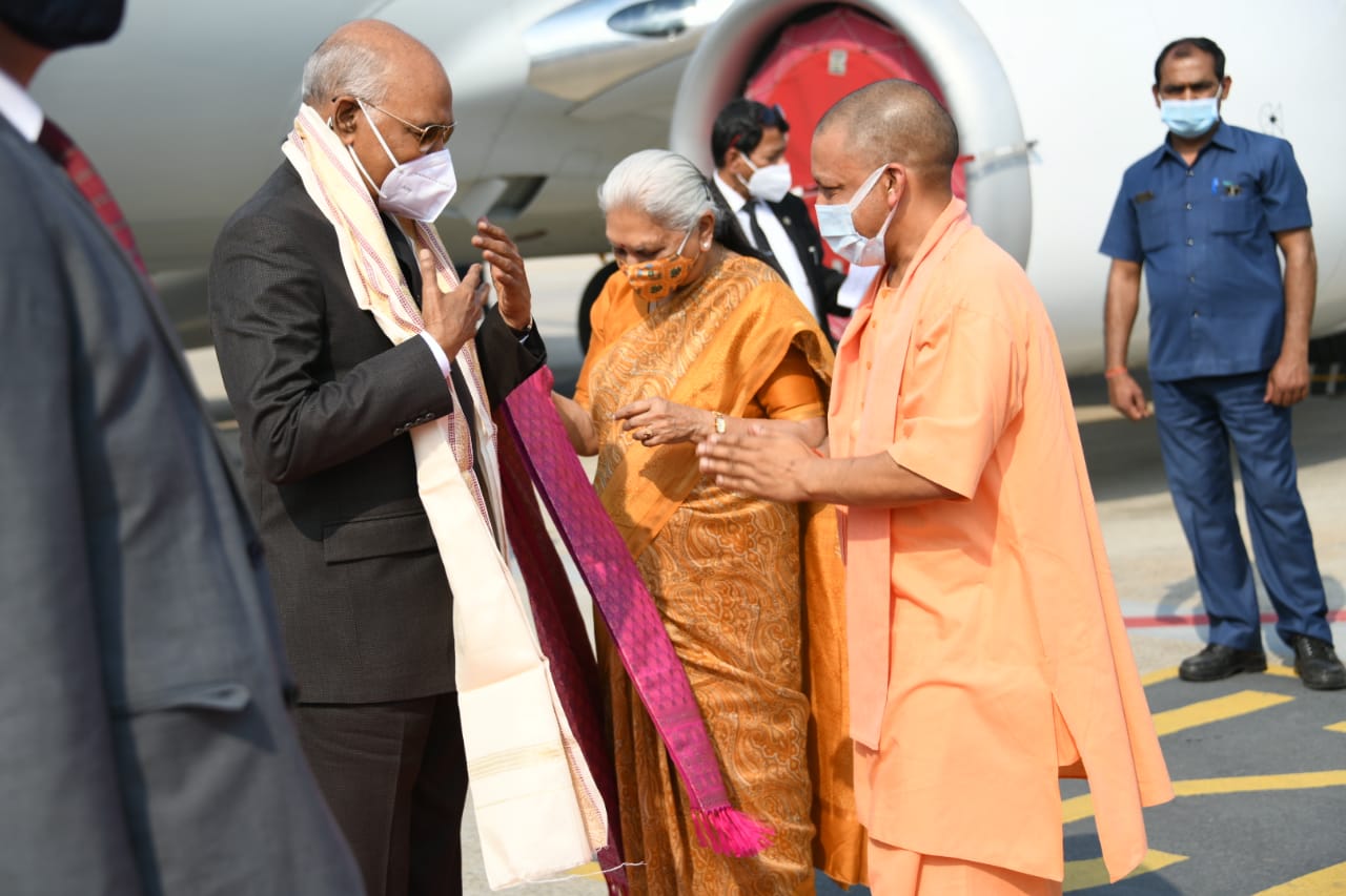 वाराणसी। राष्ट्रपति रामनाथ कोविंद अपने तीन दिवसीय वाराणसी दौरे के दौरान शनिवार को सपरिवार वाराणसी पहुंचे। लाल बहादुर शास्त्री अंतर्राष्ट्रीय हवाई अड्डा पर राष्ट्रपति का स्वागत उत्तर प्रदेश की राज्यपाल आनंदीबेन पटेल, मुख्यमंत्री योगी आदित्यनाथ, पर्यटन मंत्री डॉक्टर नीलकंठ तिवारी, मंत्री रविंद्र जायसवाल, सांसद बीपी सरोज, विधायक सौरभ श्रीवास्तव सहित कमिश्नर दीपक अग्रवाल, आईजी विजय सिंह मीणा ने किया। मुख्यमंत्री ने राष्ट्रपति का शाल ओढ़ाकर एवं पुष्पगुच्छ देकर स्वागत किया।