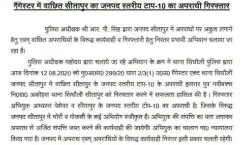 जिसके विरुद्ध जनपद के रामपुर कला थाना अटरिया, कोतवाली सिधौली, तंबौर में दर्जनों मामले चोरी व गोकशी आदि के दर्ज हैं। उन्होंने बताया कि अपराधी की अर्जित की गई संपत्ति को जब्त करने की कार्रवाई की जाएगी। पुलिस टीम में कोतवाली प्रभारी सहित उपनिरीक्षक मनोज गुप्ता, हेड कॉन्स्टेबल सुरेश राठौर, अजय कुमार राय, कॉन्स्टेबल प्रशांत सहित टीम में शामिल रहे।
