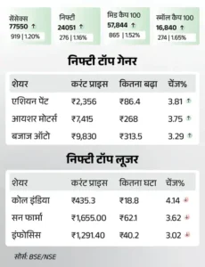भारतीय शेयर बाजार में आज भारी गिरावट देखने को मिली है। BSE Sensex करीब 1000 अंक गिरकर 76,500 के स्तर पर कारोबार करता नजर आया, जबकि Nifty 50 भी लगभग 300 अंक टूटकर 23,750 के आसपास पहुंच गया।