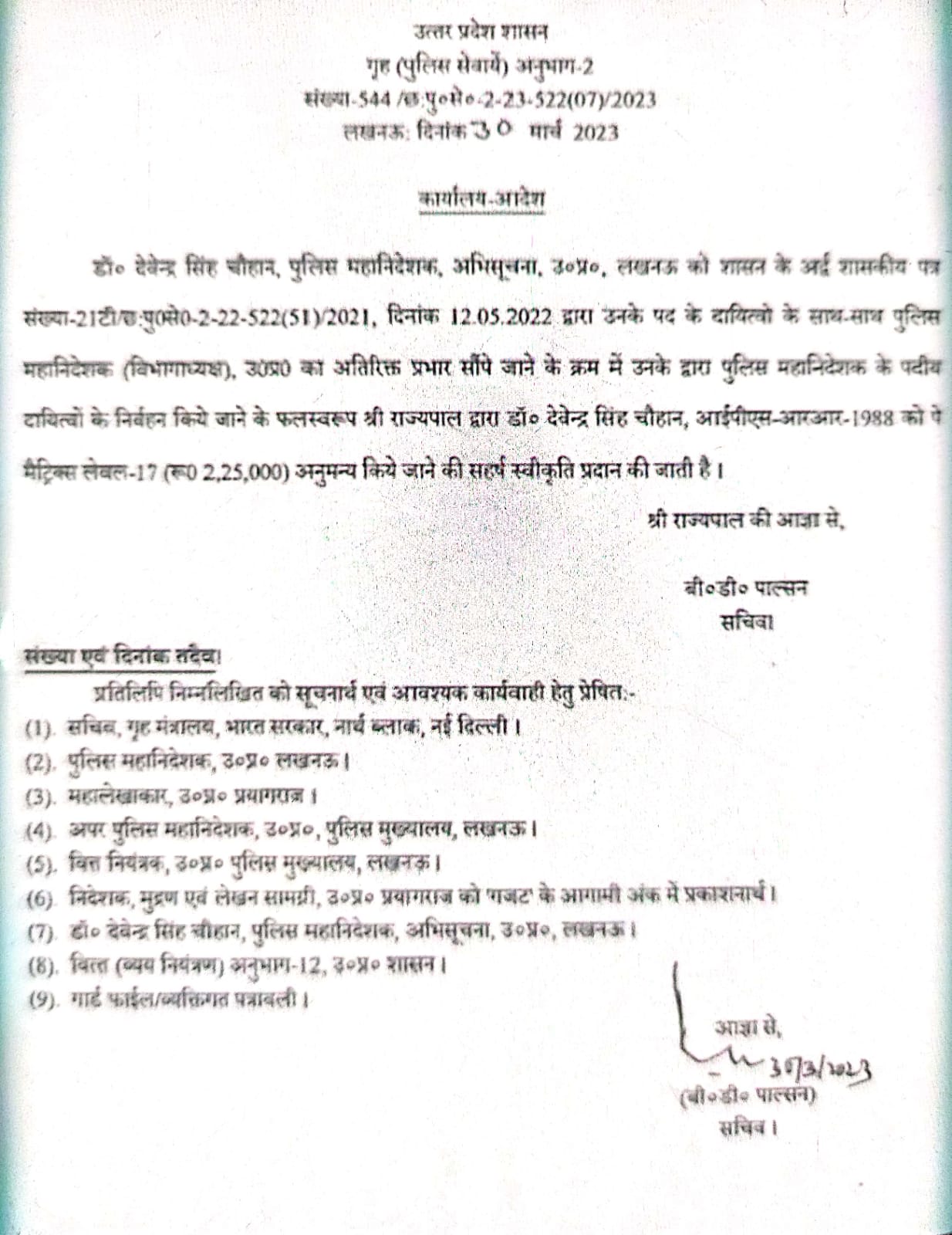 1988 बैच के आईपीएस अधिकारी डॉ0 डीएस चौहान को मिला डीजीपी का दर्जा अभी तक वह कार्यवाहक डीजीपी थे। आज रिटायर होंगे आईपीएस अधिकारी डीएस चौहान। उत्तर प्रदेश के कार्यवाहक डीजीपी डीएस चौहान को रिटायरमेंट से 24 घंटे पहले आईपीएस- पे मैट्रिक्स लेवल 17 (वेतनमान) दिए जाने को लेकर उत्तर प्रदेश के राज्यपाल ने मंजूरी दे दी है अब उन्हें डीजीपी स्तर का वेतनमान दिया जाएगा।