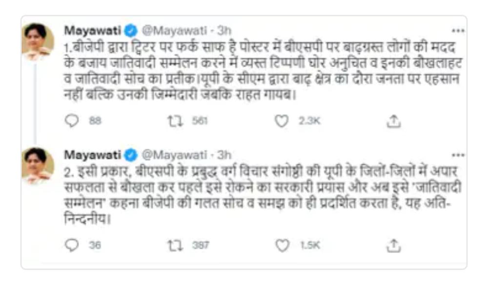 BJP के इस पोस्टर का मायावती ने भी ट्वीट करके जवाब दिया है। लिखा, ‘भाजपा द्वारा ट्विटर पर फर्क साफ है। पोस्टर में बीएसपी पर बाढ़ग्रस्त लोगों की मदद के बजाय जातिवादी सम्मेलन करने में व्यस्त टिप्पणी घोर अनुचित व इनकी बौखलाहट व जातिवादी सोच का प्रतीक। यूपी के सीएम द्वारा बाढ़ क्षेत्र का दौरा जनता पर एहसान नहीं बल्कि उनकी जिम्मेदारी जबकि राहत गायब।’ एक अन्य ट्विट में मायावती ने लिखा, ‘इसी प्रकार, बीएसपी के प्रबुद्ध वर्ग विचार संगोष्ठी की यूपी के जिलों-जिलों में अपार सफलता से बौखला कर पहले इसे रोकने का सरकारी प्रयास और अब इसे ‘जातिवादी सम्मेलन’ कहना बीजेपी की गलत सोच व समझ को ही प्रदर्शित करता है। यह अति-निन्दनीय है।’