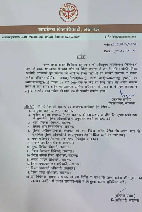 उत्तर प्रदेश सरकार ने राजधानी लखनऊ के सभी शॉपिंग मॉल सभी जिम सभी स्विमिंग पूल और सभी डिस्को क्लब आदि को 31 मार्च तक बंद रखने का आदेश तत्काल प्रभाव से जारी कर दिया है। यह आदेश गाजियाबाद के शॉपिंग मॉल पर भी लागू होगा शासन के निर्देश भी जारी कर दिए हैं।