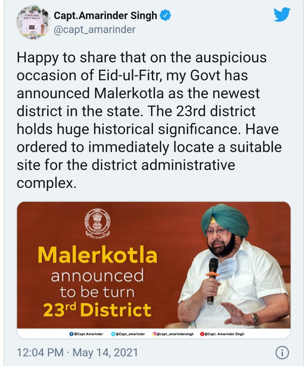 Punjab Chief Minister Capt Amarinder Singh on Friday announced Malerkotla, a Muslim-dominated area, would be the 23rd district of the state.